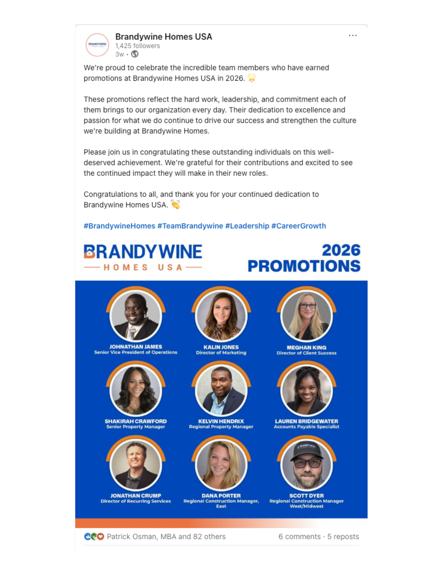 We congratulate the Brandywine Homes USA team members on their achievements and look forward to seeing the continued impact they will make in their new roles.